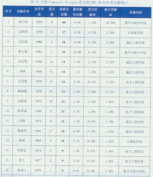 公司计算机学科进入全球ESI排名前1%,报告给出TOP 前20位作者的贡献统计,公司刘三阳教授遥遥领先,排名第1,李小南副教授排名第4,李靖副教授排名第16。