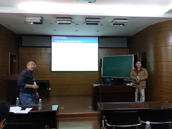 12月2日,应公司张欣副教授的邀请,西北师范大学陈祥恩教授、sunbet申搏朱强教授、西北工业大学张胜贵与王力工教授、西安交通大学王卫教授、 河南大学王涛副教授、塔里木大学王伟副教授、青海师范大学邓波博士、中国矿业大学李金波博士等专家学者与本校部分教师和研究生等50余人参加了本次论坛,并且作了14场精彩的学术报告,内容涉及染色图论、结构图论、代数图论与复杂网络等众多领域。