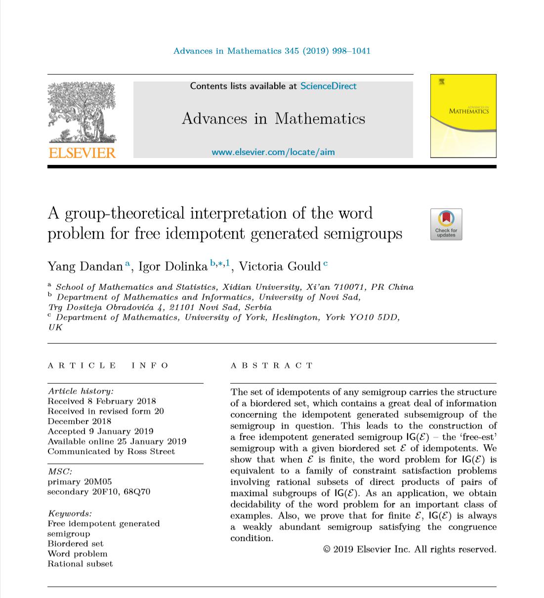 近日,sunbet杨丹丹副教授与塞尔维亚诺维萨德大学Igor Dolinka教授和英国约克大学Victoria Gould教授合作,在国际顶级数学期刊《Advances in Mathematics》上发表了题为“A group-theoretical interpretation of the word problem for free idempotent generated semigroups”的学术论文,正式发表期卷号: Advances in Mathematics, 345, 2019, 998-1041。