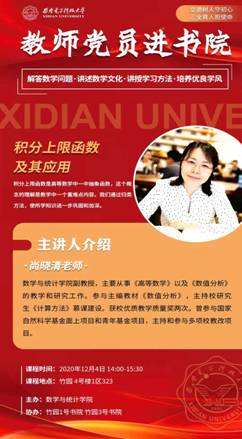 第六期的主讲老师为教师党员尚晓清老师和刘丹老师。尚晓清老师进驻竹园3号书院,为同学们讲解积分上限函数及其应用。