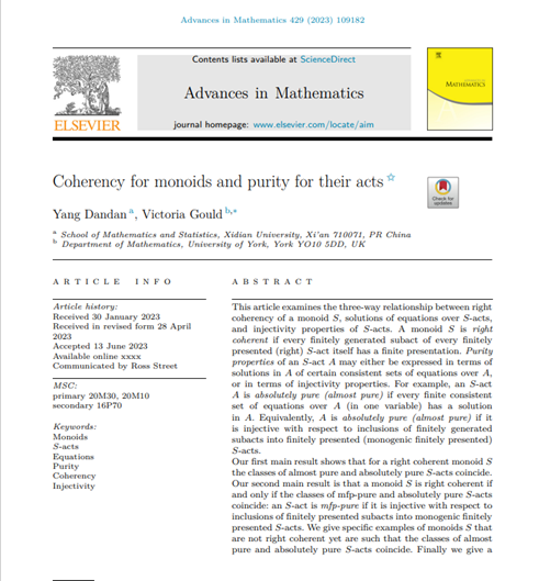 近日,西电sunbet杨丹丹教授与英国约克大学Victoria Gould教授合作,在数学领域国际顶级期刊Advances in Mathematics上发表了题为“Coherency for monoids and purity for their acts”的长达47页学术论文。这是继2019年之后,杨丹丹再次在此刊发表论文。期刊Advances in Mathematics(数学进展)创刊于1961年,致力于发表纯数学各领域具有突破性的重要成果,是业内公认的数学类顶级期刊,具有很高的学术声誉。杨丹丹教授此次发表论文是西电在数学研究领域的重要突破。