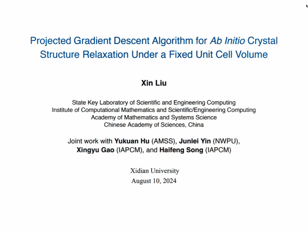 论坛分为四节,包括大会邀请报告及自由提问研讨环节。8月10日上午第一节,中国科公司刘歆研究员、哈尔滨工业大学边伟教授分别做了题为“Projected Gradient Descent Algorithm for AB Initio Crystal Structure Relaxation Under a Fixed Unit Cell Volume” 和 “Nonsmooth Convex-Concave Saddle Point Problems with Cardinality Penalties” 的报告。