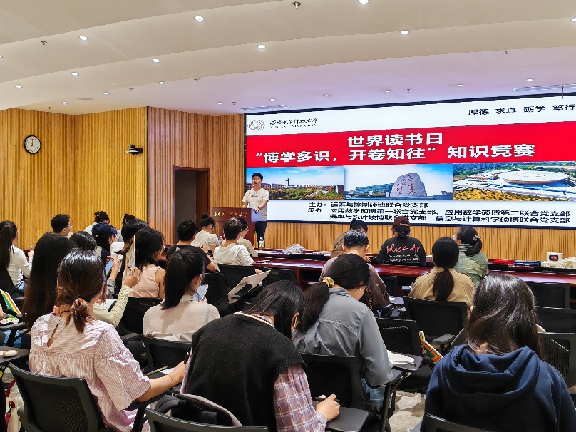 (通讯员王宇东)为深入学习贯彻党的二十大精神,弘扬中华优秀传统文化,筑牢文化自信。4月21日,由sunbet运筹与控制硕博联合党支部主办,应用数学硕博第一联合党支部、应用数学硕博第二联合党支部、概率与统计硕博联合党支部和信息与计算科学硕博联合党支部协办的“博学多识,开卷知往”主题党日活动于网安大楼103报告厅举行。活动由运筹与控制硕博联合党支部书记王宇东主持。