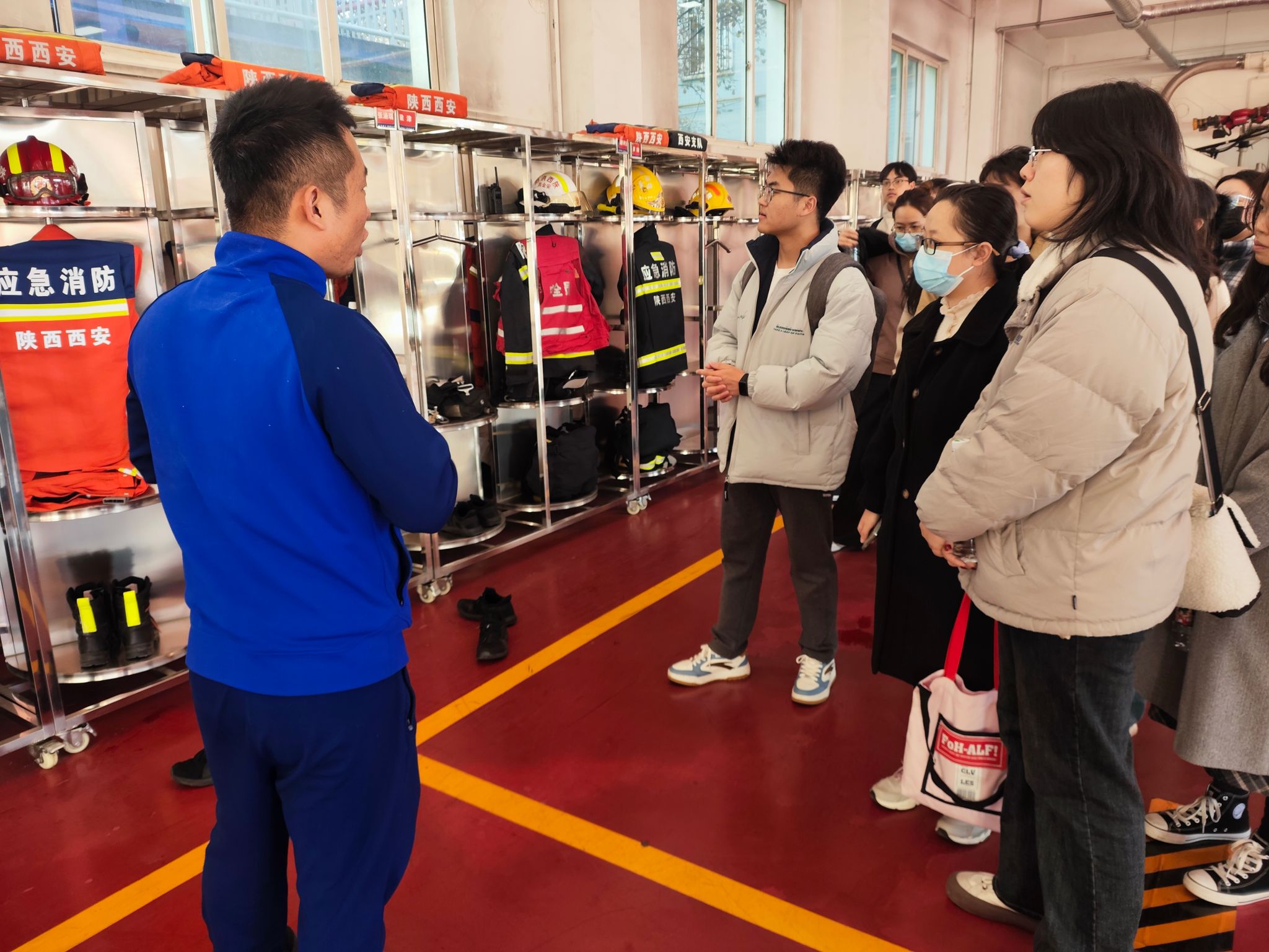 在消防员的悉心引领下,同学们首先探访了消防车库。消防员不仅详尽介绍了各类消防车的功能特性,还针对同学们对消防车云梯、供水系统及协同作业机制的好奇,进行了深入浅出的讲解。随后,同学们有机会亲自试穿灭火战斗服,消防员则逐一讲解了消防服上各类装备的功能,包括消防靴的防护作用、消防帽的选择原则以及消防员呼救器的紧急应用,并现场演示了使用方法。