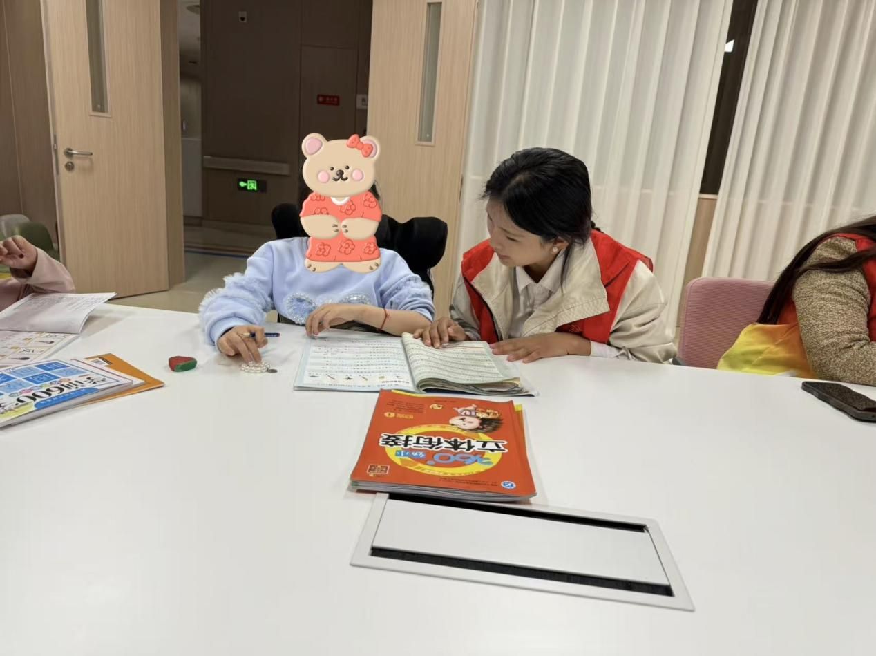 抵达康复科后,志愿者们迅速根据每个孩子的具体需求进行了一对一匹配,大家分工明确,各展所能。有的为孩子们开展课程辅导,耐心细致地讲解知识点,鼓励孩子们积极思考、勇敢提问,帮助他们解决学习上的困惑。有的坐在孩子身旁,绘声绘色地为他们讲故事,积极与孩子们进行互动,引导他们分享自己的感受和想法,激发孩子们的想象力和表达能力。为培养孩子们的兴趣爱好,志愿者们还组织了丰富多彩的兴趣活动。在折纸环节,孩子们和志愿者一起动手,折出了漂亮的风车和精致的千纸鹤。大家边折纸边交流,现场气氛十分活跃。在拼积木的过程中,孩子们充分发挥创造力,拼出了宝剑、花朵等各种造型。志愿者们共同见证了孩子们的创意成果。