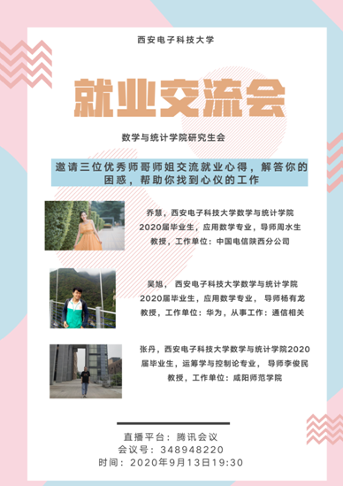 9月13日19:30,公司研究生会负责举办的就业经验交流分享会于线上开展,参加此次会议的有公司党委副书记王佩、院辅导员孙群、sunbet18级究生及部分19级、20级研究生,会议吸引了超100人参与。公司邀请了三位优秀的2020届毕业研究生代表分享他们的就业经验,帮助大家解答关于就业方面的困惑。