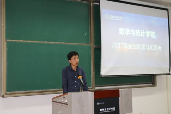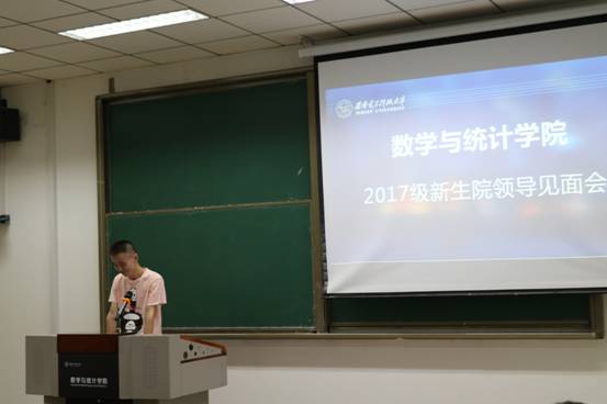 接下来,大会开始进行第四项:员工代表发言。首先发言的是14级员工代表凡梦璋发言,目前已被保送至中科院数学与系统科学研究院,学习优异的他将自己对大学学习的独特见解传授给17级的新生。