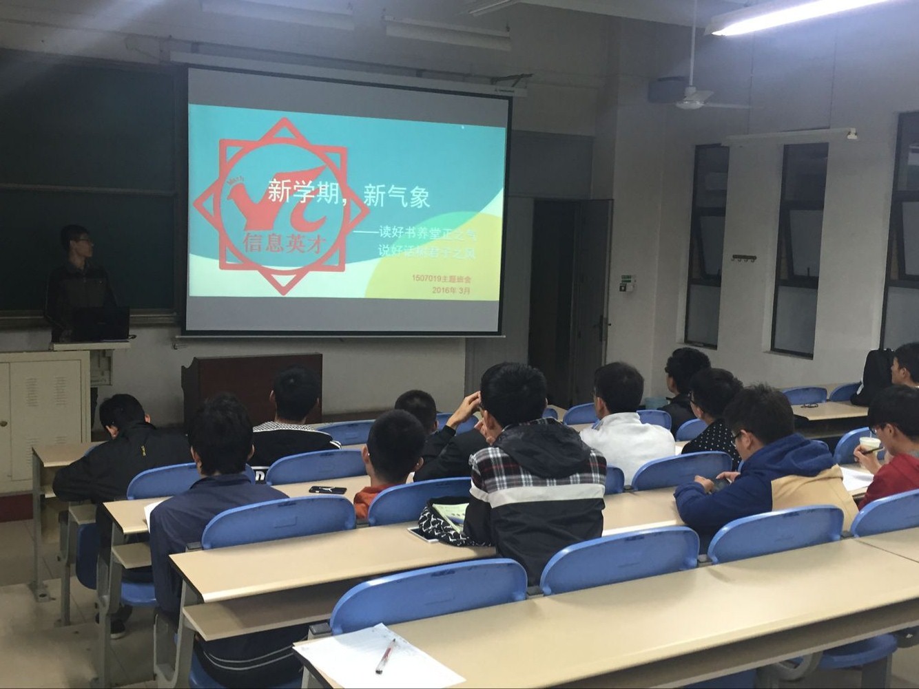 3月20日,2015级英才班在B-507教室举办了“新学期,新气象”主体班会,全班同学积极响应参加班会。本次班会是新学期英才班的第一次班会,包括班委重新组建、班级板报设计、团支部活动安排、辅导员总结四个部分。