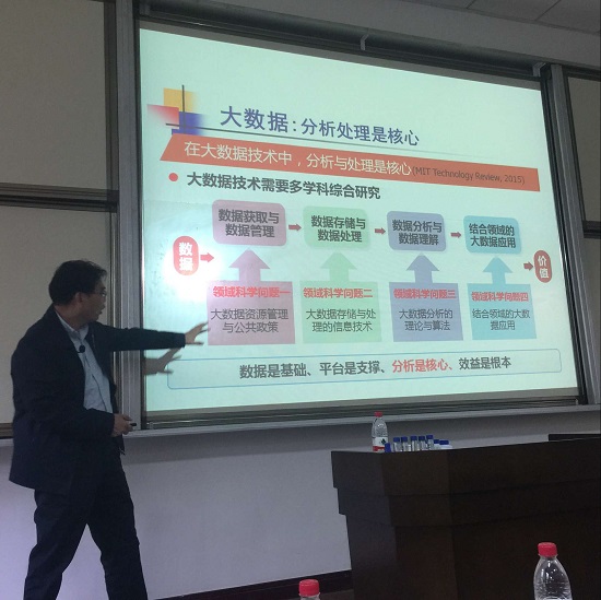 论坛学术报告阶段,西安交通大学徐宗本院士题为《大数据的共性基础问题与分析技术图谱》的报告拉开序幕。徐院士为大家介绍了大数据的时代特征及其时代任务,提出了数据是根本、平台是支撑、分析是核心、效益是根本并通过分布式学习和White box深度学习两个实例为大家做具体的讲解。徐院士的报告深入浅出、语言幽默风趣,报告过程中掌声不断。