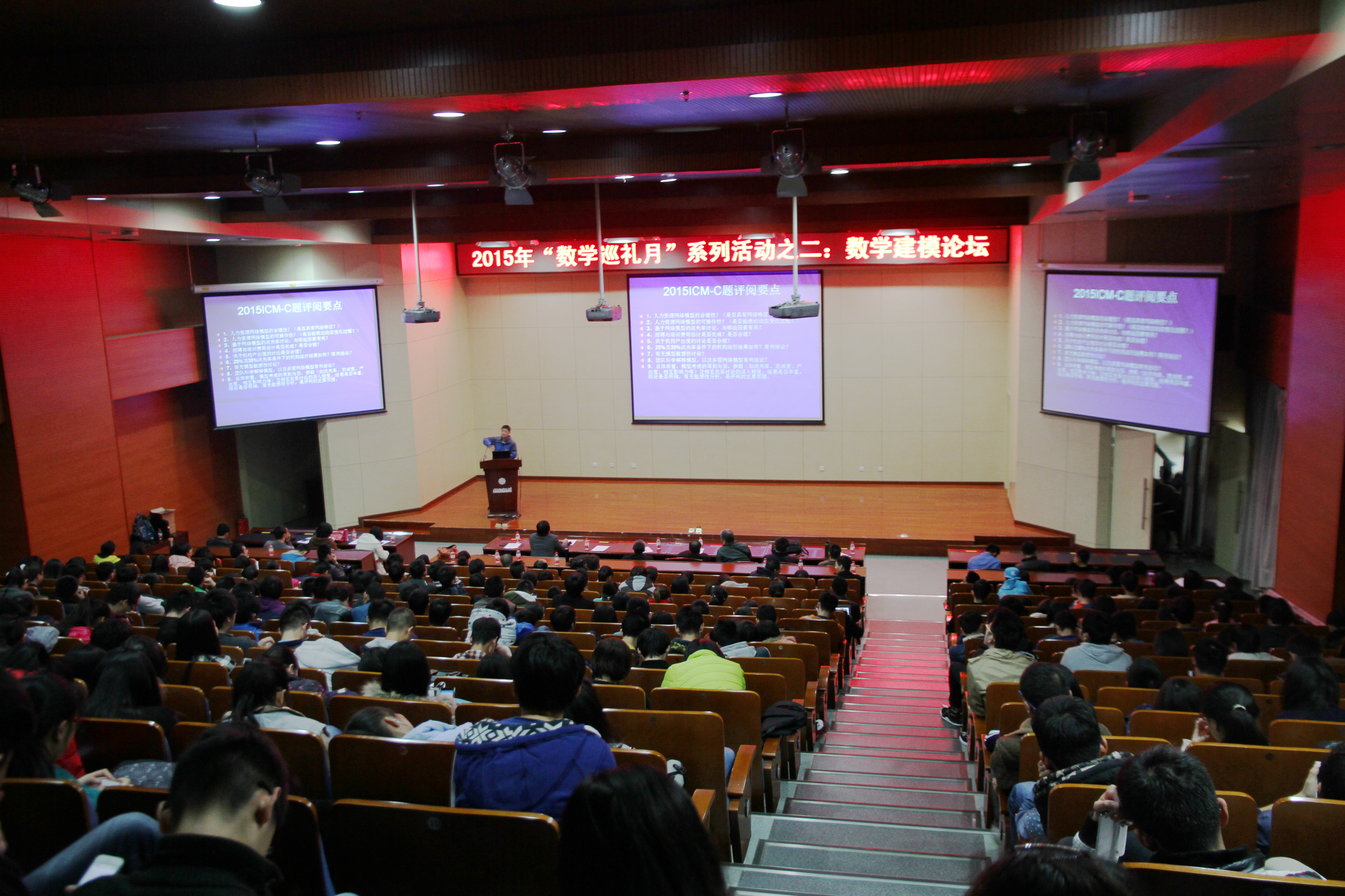 2015年11月21日下午2点,公司在新校区行政楼210报告厅举办数学建模论坛,此次论坛是公司校庆月——“数学巡礼月”系列活动之一。西安交通大学周义仓教授、西北工业大学肖华勇副教授、2015年全国老员工数学建模竞赛本科组唯一的MATLAB创新奖获得者张鹏程团队以及2015年中国高校SAS数据分析大赛初赛陕西赛区优胜队代表刘精昌分别作了报告。论坛由公司党委副书记房亮主持,公司数学建模基地有关教师和员工400余人参加了此次论坛。