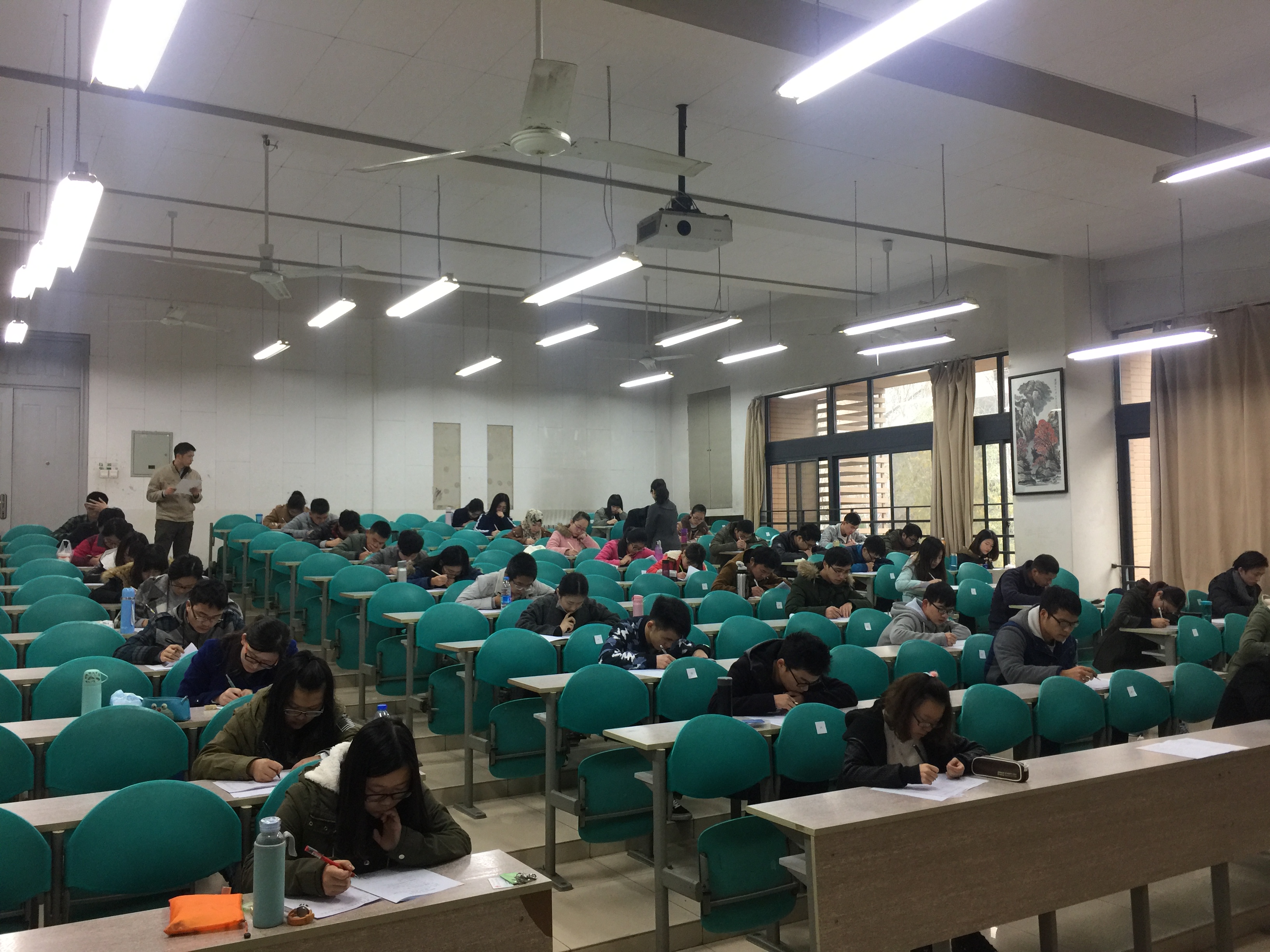 铃声一响,考场内的气氛严肃而紧张,在这气氛之下是一股拼搏的激流暗涌。监考老师下发考卷,同学们拿到试卷后一致埋头动笔,竞赛的号角就此吹响。考场如战场,气氛严肃而紧张,在这气氛之下是考题与考生之间的没有硝烟的刀光剑影。时间在无声无息之间悄然流逝,竞赛的鸣金声即将响起,监考老师在最后一刻即将来临之前叮嘱着考生对个人信息的最后确认。竞赛进行到中段,参赛者们的精神越发集中,他们聚精会神地以思考的目光审视着题目,水笔在纸上停停走走,时而因得出答案而喜上眉梢,时而因思维滞停而抓耳挠腮。