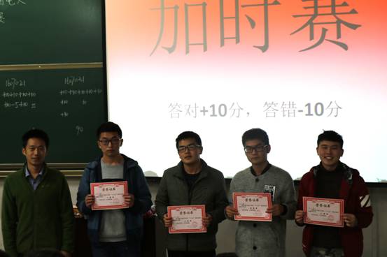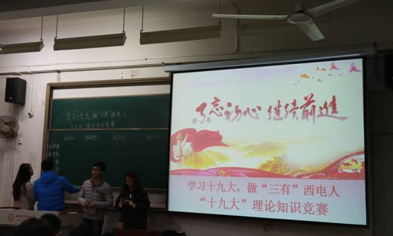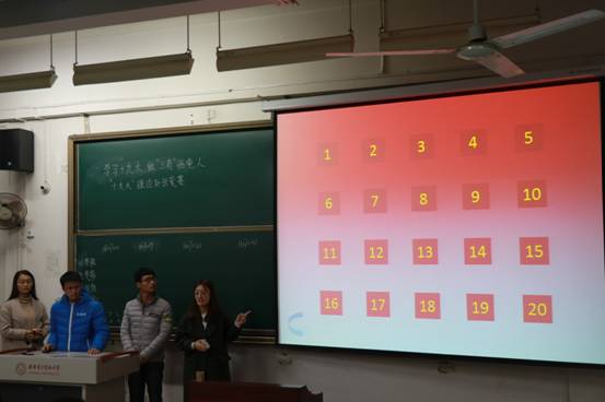 六点整,在各班团支书为大家介绍完比赛规则后,比赛正式开始。第一个环节为必答题,各队伍依次抽题作答。第一轮结束后各队伍得分基本相同。接下来则到了紧张激烈的抢答题环节。在这轮比拼过后,各支队伍之间的得分开始出现差距,现场气氛进一步活跃。第三个环节是难度最大的“冒险题”。各队伍轮流选题作答,答对一题加三十分,打错则要扣十分。通过三轮比赛,最终应数队以105分取得本次比赛的冠军。靳志伟老师为同学们再次介绍了“十九大”的新提法、新理论以及其相关重要概念,通过靳老师的讲解使同学们对“十九大”进一步加深了认识和理解。