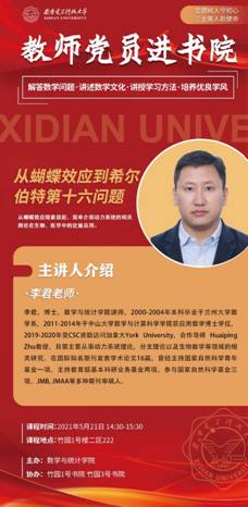 随着上一期“教师党员进书院”活动的顺利开展,活动成效显著,同学们受益匪浅。为继续加强“三全育人”精神,培养优良学习作风,第十期活动于5月21日下午2:30到3:30在竹园书院进行。李君老师进驻竹园1号书院,本次活动中李君老师以“从蝴蝶效应到希尔伯特第十六问题”为主题,从“蝴蝶效应”谈起,简单地介绍了动力系统的相关理论及其在生物、医学中的定量应用。首先,李老师讲了“蝴蝶效应”的起源及其所代表的理论问题,通...